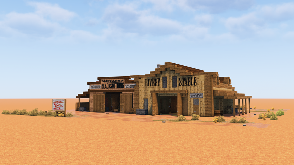 A detailed Minecraft Wild West Blacksmith & Livery Stable. Owned by the Tannen family.